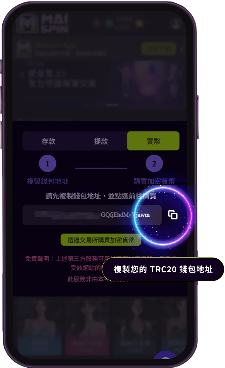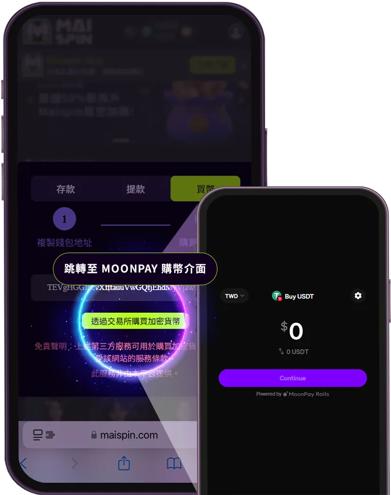 - 本平台僅提供儲值地址,購幣與付款流程由MoonPay負責。