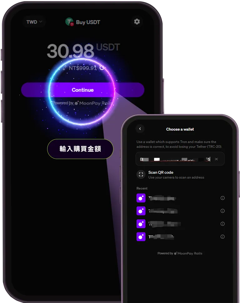 MoonPay 是一個簡單、安全的法幣入金服務,您可以使用信用卡或 Apple Pay 直接購買 USDT,並充值到平台提供的 TRC20 錢包地址。以下是完整教學流程,讓您 3 分鐘內完成充值入帳!