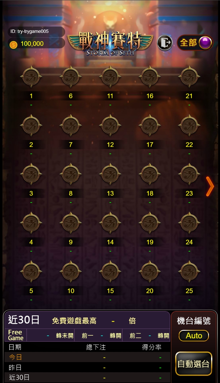 《戰神賽特》是一款滾輪式的 2D 老虎機遊戲,具備自由選台功能,讓玩家可依照各台表現挑選爆分機會最佳的位置。當畫面上出現 3 至 6 個寶藏符號 時,將立即觸發免費旋轉獎金遊戲,進入寶藏聖域開始加乘贏分之旅。在免費遊戲中,每一次旋轉都可能獲得更高倍數的回報,加上遊戲內建的高波動設計,讓整體爆擊潛力十足。