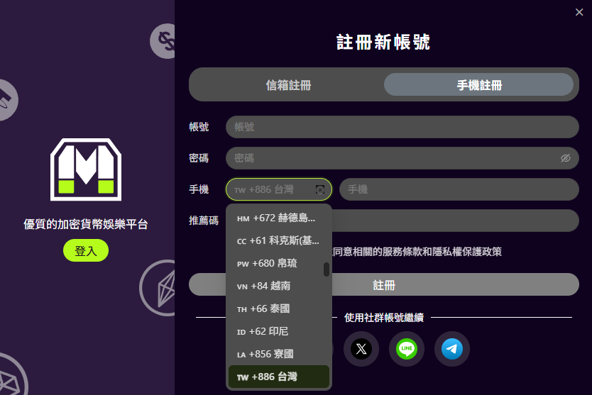 - 選擇「手機註冊」分頁