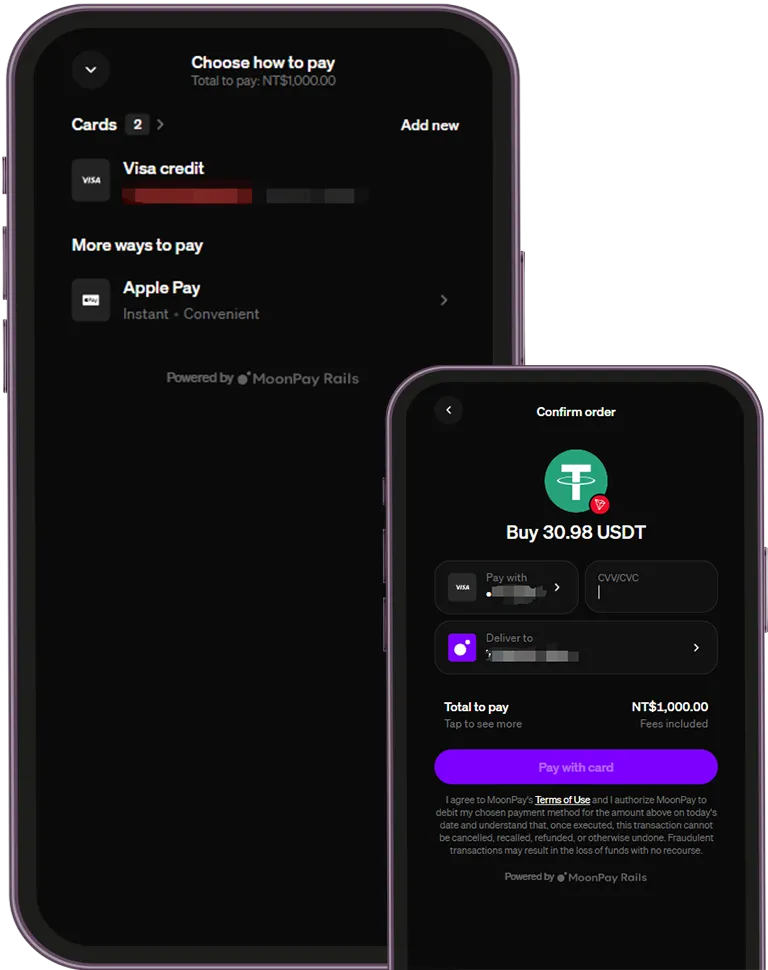 MoonPay 是一個簡單、安全的法幣入金服務,您可以使用信用卡或 Apple Pay 直接購買 USDT,並充值到平台提供的 TRC20 錢包地址。以下是完整教學流程,讓您 3 分鐘內完成充值入帳!